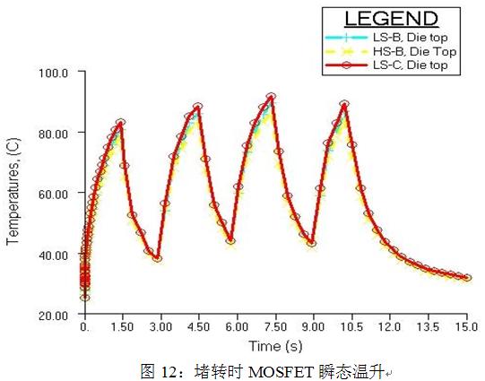 由圖10可知,堵轉(zhuǎn)時(shí)一直導(dǎo)通的下管最熱,溫度已接近150℃。由圖11可知,在堵轉(zhuǎn)100秒后MOSFET的溫升還未穩(wěn)定,如果一直堵轉(zhuǎn),必將燒壞MOSFET。因此,如果使用仿真中的散熱器尺寸,就不能一直堵轉(zhuǎn),必須采取相應(yīng)的保護(hù)措施。我們可以采用間隙保護(hù)的方法,即當(dāng)電機(jī)堵轉(zhuǎn)時(shí),堵轉(zhuǎn)一段時(shí)間,保護(hù)一段時(shí)間,讓MOSFET的溫度不超過最大結(jié)點(diǎn)溫度。圖12所示為堵轉(zhuǎn)1.5s,保護(hù)1.5s的瞬態(tài)溫升示意圖,由圖可知,采用這種方法可以有效地保護(hù)MOSFET。