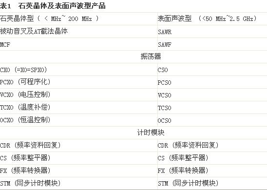 因為有線及無線市場的快速成長,石英晶體及其高頻所需的表面聲波(SAW)裝置已受到廣泛運用,范圍從電子玩具所使用的簡單被動石英晶體,到最精密電信網(wǎng)絡(luò)骨干頻率所使用的復(fù)雜同步計時模塊(STM)(表1)。如前篇文章所述,從2000~2001年的「.COM」市場瓦解之后,對于石英晶體及石英振蕩器的需求,以每年4~10%之間穩(wěn)定增加。而頻率控制產(chǎn)品的產(chǎn)業(yè)大環(huán)境,也經(jīng)歷巨大的變化。