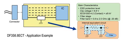 東芝美國電子元器件公司(TAEC)最新推出具有靜電放電(ESD)保護(hù)和電磁干擾(EMI)濾波的二極管。東芝DF3S6.8ECT保護(hù)二極管提供數(shù)字和移動(dòng)器件如:手機(jī),PDA,筆記本電腦,數(shù)碼相機(jī),以及具有EMI和ESD保護(hù)的GPS設(shè)備,這些靜電放電能源通過用I/O端口和通過連接器進(jìn)入到系統(tǒng)電路板上。