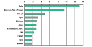 ①有6家臺(tái)灣企業(yè),2家日本企業(yè)(含TDK-Lambda),2家美國(guó)企業(yè),1家歐洲企業(yè)名列前位;
