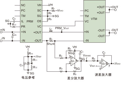 上述電路由電壓參考、分流電阻、差分放大器和誤差放大器組成。低端檢測(cè)電路是在PRM輸出端用配置為差分放大器的一個(gè)運(yùn)放實(shí)現(xiàn)的。分流電阻(R1)上的電壓經(jīng)檢測(cè)并被放大電阻R2到R5確定的增益倍數(shù)。參考電壓使用精確可調(diào)的分流參考產(chǎn)生,并連接到誤差放大器的同相端子。這是誤差放大器用以與差分放大器輸出(VSENSE)比較的電壓。誤差放大器的輸出(VEAO)經(jīng)過(guò)電阻R7和R8連接到SC,從而實(shí)現(xiàn)PRM輸出設(shè)置點(diǎn)的調(diào)整。誤差放大器將調(diào)整PRM輸出電壓,直到VSENSE等于參考電壓VREF。這將迫使VTM輸入電流以及VTM輸出電流成為由VREF確定的常數(shù)。