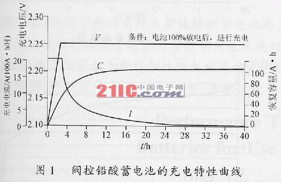 以國內(nèi)外使用最多也最為普遍,研究分析也最為深刻的鉛酸蓄電池為例。請觀察一幅在研究閥控式鉛酸蓄電池技術(shù)方面,經(jīng)??吹胶陀玫降膱D1。這里我們要說明的是,這幅圖是專家們拋開日常環(huán)境溫度變化對蓄電池充電過程的影響,用經(jīng)過改進的恒壓限流方法對蓄電池充電所獲得的。因是恒壓限流充電方式,所以代表電流變化的I線,起始段有一小段是限流值。代表電壓的V線起始段是一段很陡的上升線,更確切地講由于充電器的限流作用應(yīng)是電壓的下跌線。