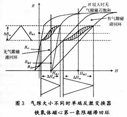 與正激開關(guān)電源變壓器不同,此反擊電源變壓器兼有儲能的作用,流過直流電流成分時容易飽和。所以要使用帶有氣隙的磁芯。原理如圖3所示。