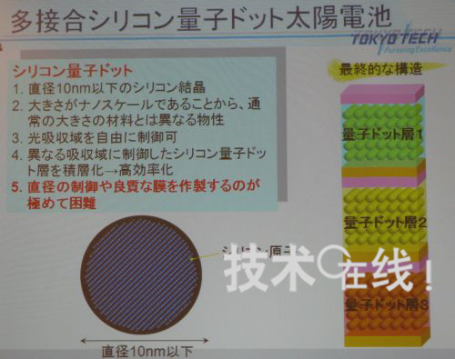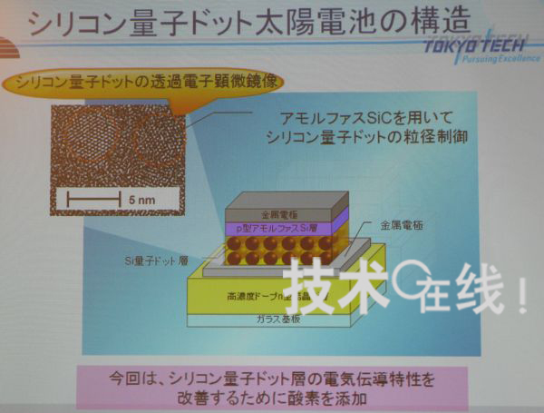 東京工業(yè)大學(xué)教授小長(zhǎng)井誠(chéng)研究小組,大幅提高了利用硅量子點(diǎn)的太陽(yáng)能電池的開放電壓(Voc)及I-V特性形狀因子(FF)數(shù)值。2010年3月10日,該消息是在應(yīng)用物理學(xué)會(huì)舉行的2010年春季應(yīng)用物理學(xué)會(huì)學(xué)術(shù)演講會(huì)的會(huì)前新聞發(fā)布會(huì)上宣布的。