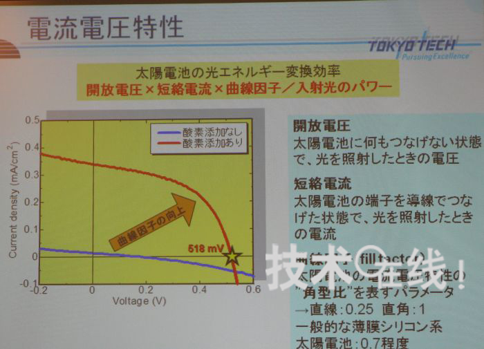 此次,小長(zhǎng)井研究小組的產(chǎn)官學(xué)合作研究員黑川康良宣布,通過向位于硅量子點(diǎn)周圍的非晶SiC層添加氧,以防止SiC的結(jié)晶化等,元件的Voc和FF值分別達(dá)到了518mV和0.51。據(jù)稱,此前的硅量子點(diǎn)太陽(yáng)能電池,澳大利亞新南威爾士大學(xué)(New South Wales University)教授M. Green小組發(fā)布的Voc=492mV為最高值。“我們的目標(biāo)是達(dá)到700~1000mV”(黑川)。