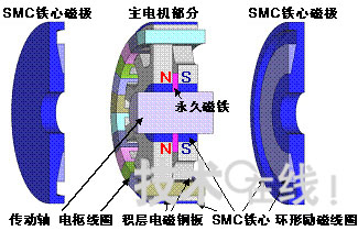 為了有效協(xié)調(diào)兩種磁鐵,名古屋工業(yè)大學采用了SMC(Soft Magnetic Composites=軟磁性復合材料)鐵心。SMC鐵心是對鐵粉等帶有磁性的粒子表面被覆絕緣層,并壓縮成形和經(jīng)熱處理而制成。能夠以低成本量產(chǎn)和成形具有復雜三維構(gòu)造的磁性部件。