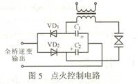 點火方式采用脈沖式點火,電路采用倍壓整流電路。圖5示出點火控制電路。全橋逆變器輸出的正向電壓先把VD2導(dǎo)通,給電容C2充電;輸出的負電壓把VD1導(dǎo)通,給C1充電。當每個電容都充電到400V時,可使800V的氣體放電管觸發(fā)導(dǎo)通,開始放電。這樣,當變壓器初級產(chǎn)生800V脈沖時,次級就會產(chǎn)生上萬伏的高壓脈沖,從而將高強度的氣體放電管雪崩擊穿。