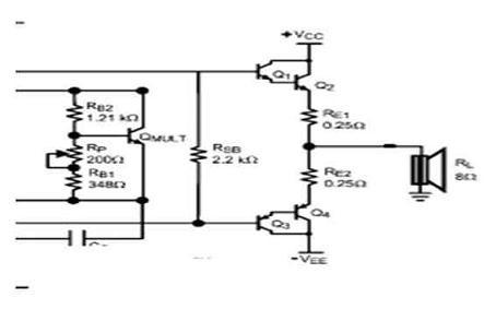 改善交越失真的最有效方法便是減少RE的電阻。對于相同數(shù)值的RE,一個平行形式的輸出可降低用來改善線性度的整體RE電阻值。同時,假如每一個級的RE都較大,那便可為輸出晶體管帶來更佳的匹配性和電流平衡。此外,RE也關(guān)系到輸出的功率損耗。對于一個相同的RE,較大的輸出電流會導(dǎo)致較大的功率損耗。RE的值取決于并聯(lián)輸出晶體管的數(shù)量和揚聲器的負載。建議采用足夠功率的0.1到0.5Ω電阻器。