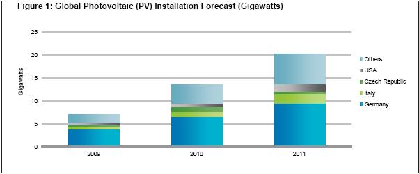圖1所示為iSuppli公司對2009-2011年全球光伏裝機容量的預(yù)測。