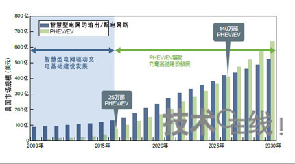 美國的充電基礎(chǔ)設(shè)施一開始將慢慢地隨著智能電網(wǎng)市場成長,而非PHEV/EV市場。智能電網(wǎng)的傳輸和分配網(wǎng)路升級的市場規(guī)模預(yù)估是依Morgan Stanley的資料製成。PHEV//EV市場規(guī)模是依據(jù)EPRI市場滲透率來預(yù)估,以每臺(tái)30000美元換算。