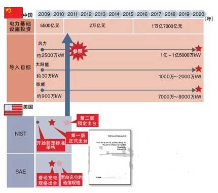 美國(guó)加緊推進(jìn)標(biāo)準(zhǔn)化是因?yàn)槊闇?zhǔn)了中國(guó)將在2011年以后向電力基礎(chǔ)設(shè)施投入的巨大投資。圖中中國(guó)的數(shù)據(jù)由海外電力調(diào)查會(huì)提供。