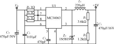 如果保證在最低輸入電壓70%Rn時(shí)電表能輸出正常的工作電壓,按線性變壓器特性,則在額定輸入電壓Un時(shí),輸出電壓會較高,如果輸出電壓整流濾波后采用一般的線性穩(wěn)壓器供電,將會使整機(jī)功耗加大;而在最高輸入電壓時(shí),將會使變壓器溫升增大,線性穩(wěn)壓電路損耗加大,發(fā)熱量也會增大;針對整機(jī)耗電較大的電子電度表,其解決辦法一是可以采用較好材質(zhì)的硅鋼片,如Z11型硅鋼片;二是低壓輸出穩(wěn)壓電路采用一個(gè)低成本的高效率DC/DC變換電路,即可使整機(jī)功耗顯著降低,還可在寬輸入電壓范圍內(nèi),穩(wěn)定、高效地工作。這些DC/DC電路可以采用簡單的低成本MC34063、LM2574等DC/DC變換器,采用MC34063設(shè)計(jì)的+5V輸出DC/DC變換器如圖3所示。