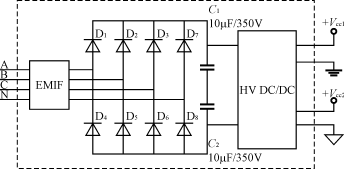 這種供電方式體積和重量較大,成本也較高,顯然按以上電路連接時(shí),對三相四線供電時(shí)不能缺零線,對三相三線供電時(shí)不能缺公共地線,如B相;另外,有的供電局用戶要求,三相電度表輸入端任意兩線有電壓輸入時(shí)都能工作,則圖5的設(shè)計(jì)便不能達(dá)到目的;當(dāng)采用三相電度表專用開關(guān)電源模塊供電時(shí),可解決以上問題,其內(nèi)部結(jié)構(gòu)圖如圖6所示。