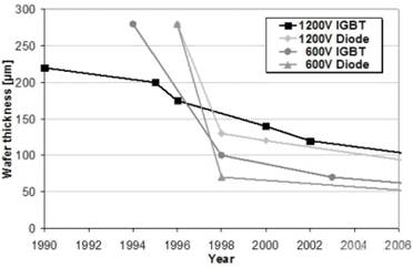 由于導(dǎo)通電壓和關(guān)斷損耗在很大程度上取決于晶圓的厚度,因此需要做更薄的IGBT。圖4顯示了英飛凌600/1,200VIGBT和EMCON二極管的晶圓厚度趨勢。對于新型1,200VRC-IGBT而言,120um厚度晶圓將是標(biāo)準(zhǔn)工藝。這需要進(jìn)行復(fù)雜的晶圓處理,包括用于正面和背面的特殊處理設(shè)備。將晶圓變薄可通過晶圓打磨和濕式化學(xué)蝕刻工藝實現(xiàn)。