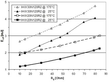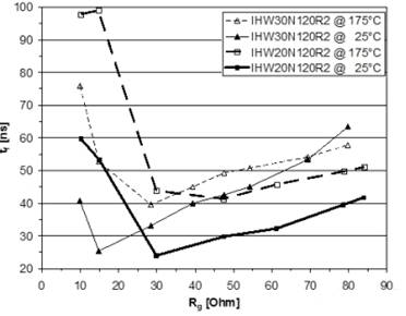 在典型飽和壓降Vce(sat)=1.6V@25℃/1.85V@175℃和典型正向電壓Vf=1.25V@175℃(額定電流)的條件下,功率損(特別是軟開關(guān)應(yīng)用的導(dǎo)通損耗)可大幅度降低。由IHW20N120R2的下降時間的切線可看出高速度—tf=24ns@25℃和Rg=30Ω(44ns@175℃)。IHW30120R2在下降時間方面是最為出色的:tf=33ns@25℃,Rg=30Ω;tf=40ns@175℃。(在硬開關(guān)條件下測量,參見帶有Eoff曲線的圖6和圖7)。