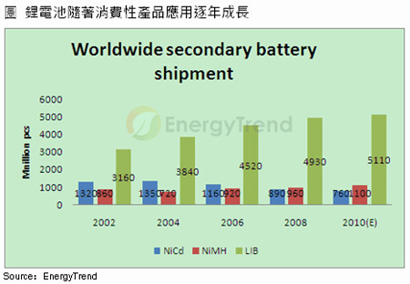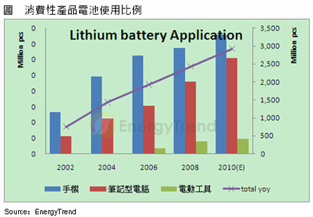 鋰電池出貨隨消費性應(yīng)用增加逐年成長
