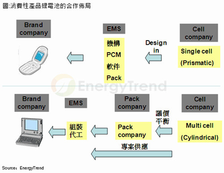以產(chǎn)品發(fā)展競爭來看,EnergyTrend表示,手機以及筆記本電腦一直是鋰電池的最大戰(zhàn)場,但也因為產(chǎn)業(yè)平衡的關(guān)系而產(chǎn)生出不同的合作模式。以手機電池來說,中端與低端產(chǎn)品市場,大多以價格為考量,也因此將使得產(chǎn)品定位陷入品質(zhì)與價格之間的掙扎,而高價位產(chǎn)品,則必須藉由在產(chǎn)品設(shè)計初期的共同發(fā)展,來設(shè)法讓零組件產(chǎn)品確保切入供應(yīng)鏈,包括正崴等手機電池廠即為一例。
