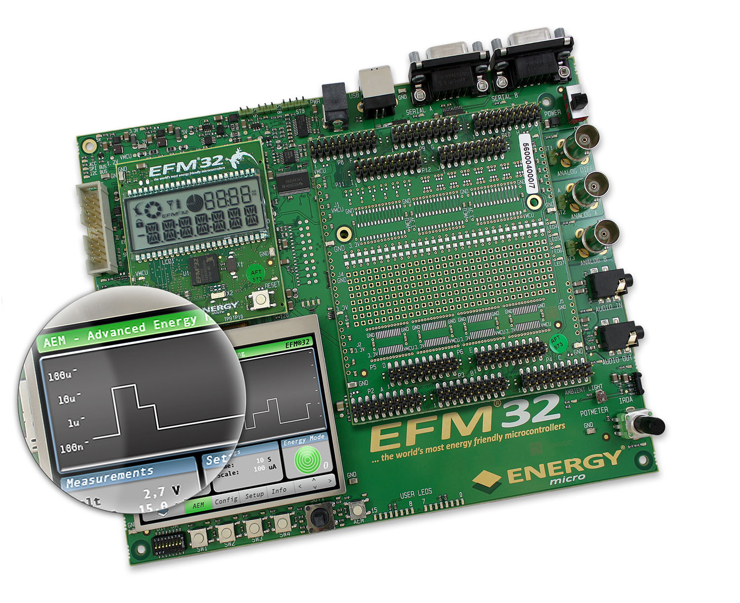 圖5. Energy Micro的EFM32 Gecko MCU系列開發(fā)工具包為用戶提供了一個獨特的先進能源監(jiān)控(AEM)系統(tǒng)。通過大量的內(nèi)置LCD屏幕和預(yù)配置的GUI,AEM使用戶可以精確地查看一個原型應(yīng)用的實時電流消耗數(shù)據(jù),從而及早發(fā)現(xiàn)和清除不良的能量排放。