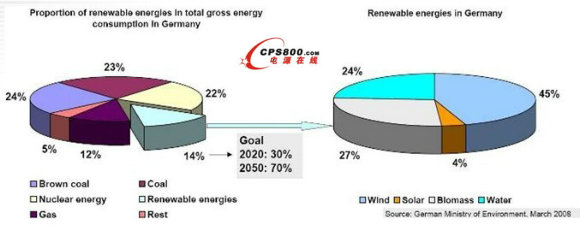 歐洲是現(xiàn)代能源和氣候政策的先驅(qū),德國是利用新能源技術(shù)方面一個最好的例證。鑒于到2020年,要實現(xiàn)減少14%的二氧化碳排放量(與2005年的排放量相比)的目標(biāo),到2020年可再生能源在初級能源消耗中的比例要增加到18%(2005年為6%)。對于德國總電力消費來說,這意味著到2020年可再生能源的份額將增加一倍,如圖2所示。展望未來,到2050年計劃可再生能源的份額達到70%。