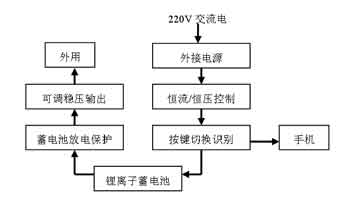 從手機鋰離子二次電池的恒流/恒壓充電控制出發(fā),用220V交流電通過配置的內(nèi)置儲能鋰電池對手機鋰離子電池充電。電路的具體工作流程如圖1所示。