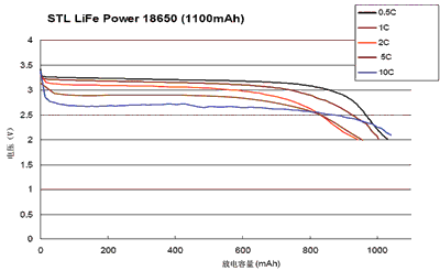一種型號(hào)為STL18650的磷酸鐵鋰動(dòng)力電池(容量為1100mAh)在不同的放電率時(shí)其放電特性如圖2所示。最小的放電率為0.5C,最大的放電率為10C,五種不同的放電率形成一組放電曲線。由圖2中可看出,不管哪一種放電率,其放電過(guò)程中電壓是很平坦的(即放電電壓平穩(wěn),基本保持不變),只有快到終止放電電壓時(shí),曲線才向下彎曲(放電量達(dá)到800mAh以后才出現(xiàn)向下彎曲)。在0.5~10C的放電率范圍內(nèi),輸出電壓大部分在2.7~3.2V范圍內(nèi)變化。這說(shuō)明該電池有很好的放電特性。