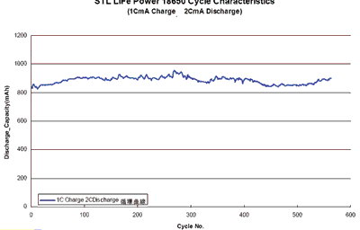 STL18650的充放電循環(huán)壽命曲線如圖4所示。其充放電循環(huán)的條件是:以1C充電率充電,以2C放電率放電,歷經(jīng)570次充放電循環(huán)。從圖4的特性曲線可看出,在經(jīng)過(guò)570次充放電循環(huán),其放電容量未變,說(shuō)明該電池有很高的壽命。