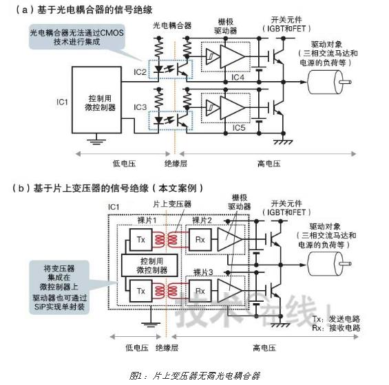 在絕緣型開關(guān)電源和交流馬達的驅(qū)動電路中,PWM信號等的絕緣一直使用光電耦合器(a)。如果能夠使用片上變壓器的話,就可以集成在微控制器上,因此可以大幅削減部件個數(shù)(b)。圖是根據(jù)瑞薩電子的資料制作而成的。