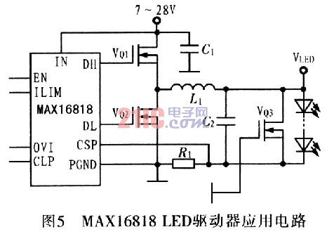 需要較高照明功率的場合,如泛光燈或霧燈,必須使用超高亮度LED(HBLED)。HBLED需要較高的驅動電流,前面討論的產(chǎn)品無法提供低成本設計,需要過多的驅動器產(chǎn)生所需的電流。最好采用能驅動大電流功率管的控制器,大電流功率管可以為HBLED提供高達30A的電流,MAXl6818可以滿足這種設計要求,如圖5所示。
