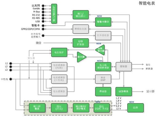 安森美半導(dǎo)體應(yīng)用于智能電表的完整解決方案安森美半導(dǎo)體應(yīng)用于智能電表的方案包含一系列標(biāo)準(zhǔn)產(chǎn)品、專(zhuān)用標(biāo)準(zhǔn)產(chǎn)品(ASSP)及專(zhuān)用集成電路(ASIC),可以提供智能電表的4種基本功能,包括:電源/電源管理、計(jì)量、寄存及通信,具體產(chǎn)品包括功率因數(shù)控制器、交流-直流(AC-DC)控制器、直流-直流(DC-DC)控制器、穩(wěn)壓器,MOSFET、整流器、三端雙向可控硅開(kāi)關(guān)元件(TRIAC),PLC調(diào)制解調(diào)器、線(xiàn)路驅(qū)動(dòng)器及信號(hào)放大器,濾波、輸入/輸出(I/O)及數(shù)據(jù)保護(hù),LCD背光驅(qū)動(dòng)器,EEPROM存儲(chǔ)器,及智能卡接口等。圖2是由安森美半導(dǎo)體的多種器件(圖中綠色部分)構(gòu)成的智能電表應(yīng)用。