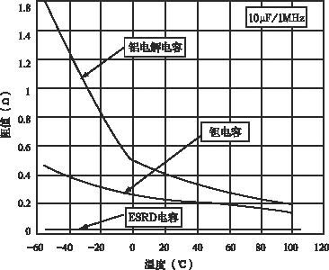圖4是三種不同的10μF電容器在溫度變化時的阻抗變化情況,可以從圖4中看出鋁電解電容器在負(fù)溫時阻抗變化較大,鉭電容性能較好,而ESRD電容在-55℃~+105℃的溫度范圍內(nèi)阻抗幾乎不變,而且三種電容中ESRD型電容器的阻抗最小。
