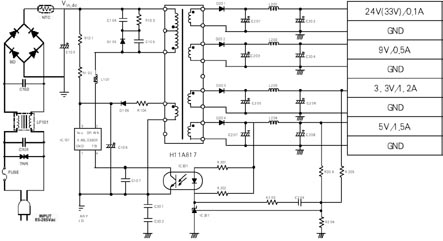 有四個(gè)次級(jí)線圈提供四路電壓輸出,通過(guò)一個(gè)光耦,由431型電壓參考器提供反饋信號(hào)。