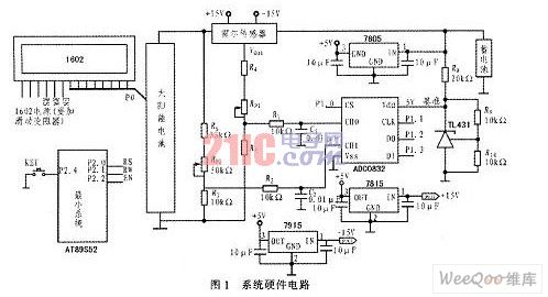 單片機正常運行需要為片內的晶體管或場效應管供給電源,使其工作在相應狀態(tài)。AT89S52需要一個5V電源(實際工作電壓為3.6~6.0V)。可用整流、穩(wěn)壓方式供電,獲得4.5V左右的電壓,因本系統(tǒng)為獨立發(fā)電,且長期使用,考慮到電源壽命,該裝置由市電或干電池提供驅動電源不符合實際,所以最佳方案應該由系統(tǒng)內部太陽能電池的蓄電池供電,經(jīng)穩(wěn)壓集成塊7805穩(wěn)壓為5V,輸入單片機Vcc引腳,驅動單片機及液晶顯示裝置。TBCl0SY霍爾電流傳感器,需±15V雙電源供電,同樣采用系統(tǒng)內的蓄電池供電.經(jīng)穩(wěn)壓集成塊7805、7915穩(wěn)壓在±15V,從而驅動其工作。