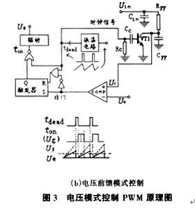 改善加快電壓模式控制瞬態(tài)響應(yīng)速度的方法有二種:一是增加電壓誤差放大器的帶寬,保證具有一定的高頻增益。但是這樣容易受高頻開關(guān)噪聲干擾影響,需要在主電路及反饋控制電路上采取措施進(jìn)行抑制或同相位衰減平滑處理;另一方法是采用電壓前饋模式控制PWM技術(shù),原理如圖3(b)所示。用輸入電壓對(duì)電阻電容(RFF、CFF)充電產(chǎn)生的具有可變化上斜坡的三角波取代傳統(tǒng)電壓模式控制PWM中振蕩器產(chǎn)生的固定三角波。此時(shí)輸入電壓變化能立刻在脈沖寬度的變化上反映出來,因此該方法對(duì)輸入電壓的變化引起的瞬態(tài)響應(yīng)速度明顯提高。對(duì)輸入電壓的前饋控制是開環(huán)控制,而對(duì)輸出電壓的控制是閉環(huán)控制,目的是增加對(duì)輸入電壓變化的動(dòng)態(tài)響應(yīng)速度。這是一個(gè)有開環(huán)和閉環(huán)構(gòu)成的雙環(huán)控制系統(tǒng)。