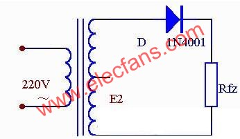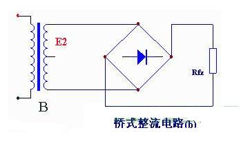 上圖是一種最簡單的整流電路。它由電源變壓器B、整流二極管D和負(fù)載電阻Rfz,組成。變壓器把市電電壓(多為220伏)變換為所需要的交變電壓e2,D再把交流電變換為脈動(dòng)直流電。