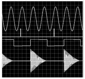 為此控制單元給SCR1和SCR2施加的控制信號的仿真波形如圖3所示,其中還包含有交流電輸入信號和震蕩輸出信號,從上到下的波形依次為輸入的交流電信號、SCR1的控制信號、SCR2的控制信號、震蕩線圈信號的波形。