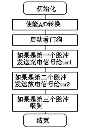 圖5是主程序流程圖。由于電路中的可控硅觸發(fā)時間要求嚴(yán)格,所以,程序中分別使用了定時器T0作為SCR1充電的觸發(fā)定時信號,定時器T1作為SCR2放電時間的定時信號。