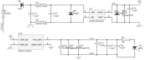 本控制模塊的電源電路如圖2所示。車載蓄電池—發(fā)電機(jī)的電源從24V_1處進(jìn)入,二極管D16主要是防止電源的正負(fù)極被誤接反。電感L1、L2對電源進(jìn)行濾波,和共模電感L3、電容C8配合,可以過濾掉電源中的尖峰脈沖。二極管D24P6KE51A是脈沖干擾抑制器(TVS),它可以快速吸收超過額定電壓的尖峰脈沖,瞬時(shí)通過電流很大,最大功率可達(dá)500~1000W。電容E5和C9進(jìn)一步對電源進(jìn)行濾波。過濾干凈的電流通過開關(guān)電源芯片LM2576變換為系統(tǒng)使用的5V電源。電容E7和C11對輸出5V電源進(jìn)行濾波,電阻R18和發(fā)光二極管D28指示當(dāng)前是否有電。
