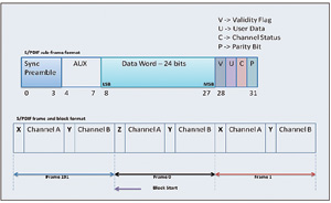 S/PDIF幀格式——首先驅動數(shù)據的最低有效位。每個幀有兩個子幀,分別是32個時隙,共64個時隙(見圖2)。子幀以一個前導碼開始,后面跟隨24位數(shù)據,最后以攜帶用戶數(shù)據和通道狀態(tài)等信息的4位結束。子幀的前4個時隙稱為前導碼,用于指示子幀和塊的開始。前導碼有三個,每一前導碼均包含一個或兩個持續(xù)時間為3UI的脈沖,從而打破雙相編碼規(guī)則。這意味著,該模式不可能存在于數(shù)據流中的其他地方。每個子幀都以4位前導碼開始。塊的開始用前導碼“Z”和子幀通道的開始“A”表示。前導碼“X”表示通道“A”子幀的開始(不同于塊的開始),前導碼“Y”表示通道“B”子幀的開始。