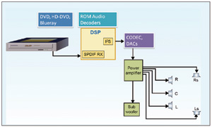 利用多聲道、多揚聲器系統(tǒng)和先進的音頻算法,音頻系統(tǒng)能夠惟妙惟肖地模擬真實聲音。這些復雜的音頻系統(tǒng)使用ASIC或DSP來解碼多聲道編碼音頻,并且運行各種后處理算法。聲道數(shù)量越多,意味著存儲器和帶寬要求越高,這就需要使用音頻數(shù)據壓縮技術來編碼并減少所要存儲的數(shù)據。這些技術還能用來保持聲音質量。