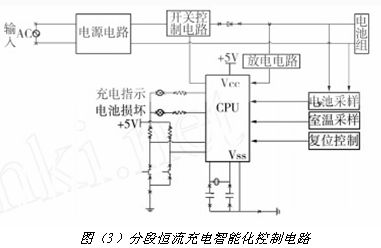 分段恒流充電智能化控制電路如圖(3)所示。該電路采用 CPU 控制,可對充電電池和充電環(huán)境溫度進行檢測,對電池充電進行計時,采用充電過程中電池的電壓和電流,對分段恒流充電過程進行控制。