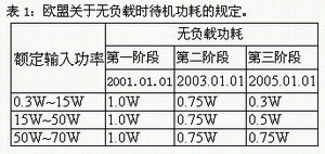 在環(huán)保意識日益受到重視的綠色時代,有效利用有限的能源已經(jīng)成為人們的共識。歐美國家對于電器產(chǎn)品在空載待機(jī)時的功耗定義了明確的規(guī)范,歐盟(EEC)公布的具體規(guī)定如表1所示,而在美國方面,從2001年7月起該國就規(guī)定政府機(jī)構(gòu)不得購買待機(jī)功耗超過1W的電器產(chǎn)品。由此可見,在不久的未來,電源轉(zhuǎn)換器低待機(jī)功耗將成為基本要求,這也是電源設(shè)計工程師必須面臨的挑戰(zhàn)。