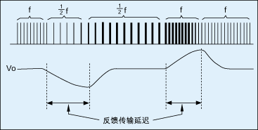 當(dāng)負(fù)載降低到一定程度時,脈沖跳躍機(jī)制將使有效開關(guān)頻率減半,這意味著轉(zhuǎn)換器供應(yīng)負(fù)載的功率減半,因此回掃電路將增加脈沖寬度以補(bǔ)足輸出負(fù)載所需要的功率,而在脈沖寬度增加到負(fù)載所需功率之前,輸出電壓將產(chǎn)生突降。相反的情形發(fā)生在等效開關(guān)頻率增加時,輸出電壓將發(fā)生突升。這種負(fù)載變動時輸出電壓突升與突降是開關(guān)頻率非連續(xù)變動(以整數(shù)倍增加或降低)的必然結(jié)果。