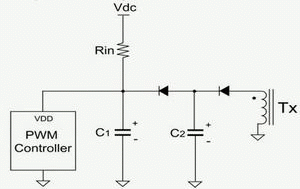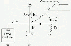 起動電路損耗在電源轉(zhuǎn)換器空載待機(jī)損耗中占很高的比例,此處我們介紹一種起動速度快且損耗低的起動電路。圖6(a)為傳統(tǒng)起動電路,其中VSTA是脈寬調(diào)制控制器起始臨界電壓,TD_ON是啟動延遲時間,TD_ON=(C1×VSTA)/IC1。使用較大輸入電阻(Rin)可以有效降低電阻損耗,但啟動延遲時間會延長。因此建議采用圖6(b)電路,其中C1電容較小,這樣在用大輸入電阻時能夠降低起動電路的損耗,同時仍然擁有較快起動速度。較大的C2電容可提供穩(wěn)定的電壓給控制器使用,不會增加起動延遲時間。