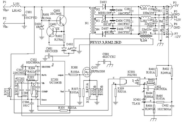 電源工作原理為:電路采用單端正激變換電路,當變換器接通電源時,輸入直流電壓經(jīng)由電阻、12V穩(wěn)壓管D601和三極管Q601、Q602組成的電路穩(wěn)壓降壓后, 啟動UC3843進入正常工作,偏置繞組L204的供電電路開始工作,輸出經(jīng)A4和C601整流及濾波后輸出12V電壓,高于自供電電壓,使二極管A4反偏,啟動電路停止工作。變換器進入正常工作后,電源依據(jù)PWM脈寬調制方式工作,次級繞組的輸出經(jīng)過二極管整流以及電容器和電感器組成的LC型濾波器濾波后,產(chǎn)生所需的各路輸出直流電壓。+5V的輸出電壓由電阻器R402和R406分壓后,與可編程穩(wěn)壓源TL431(U3)中的2.5V參考電壓比較,然后通過光耦合器U2反饋到UC3843的2腳,控制脈沖的占空比,穩(wěn)定5V輸出。耦合電感L202和L203實現(xiàn)+/-12V兩路穩(wěn)壓。過流保護電阻R101、R102檢測到開關管的過流信號,送入3843的3腳,封鎖UC3843的輸出信號,實現(xiàn)過流保護。