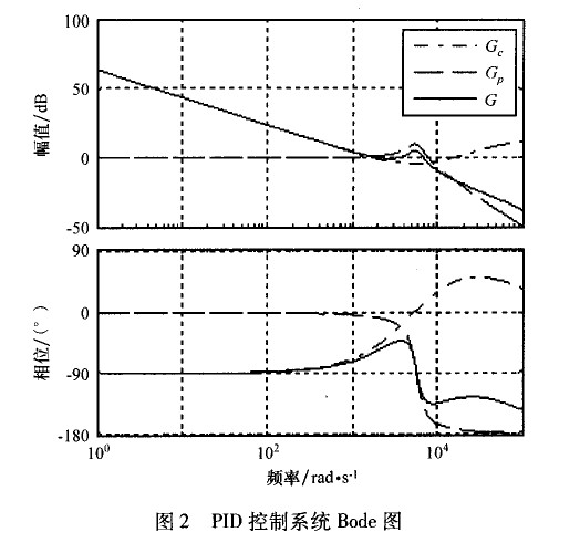 圖2中G為PID控制系統(tǒng)開(kāi)環(huán)傳遞函數(shù),由其頻率特性曲線可以看到,系統(tǒng)低頻開(kāi)環(huán)增益非常大;截止頻率附近頻段相角裕度增大;高頻段開(kāi)環(huán)增益很小,抑制了高頻干擾信號(hào)。通過(guò)滯后一超前相校正方法對(duì)PID控制器進(jìn)行設(shè)計(jì),達(dá)到了預(yù)期的目的。經(jīng)過(guò)以上分析,PID傳遞函數(shù)為: