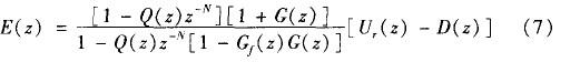 Q(z)、Gf(z)為低通濾波補(bǔ)償器,是重復(fù)控制器設(shè)計(jì)工作的重點(diǎn)。P(z)的作用是將開(kāi)環(huán)增益調(diào)節(jié)至很大的有限值,在不影響穩(wěn)態(tài)精度的前提下保證系統(tǒng)穩(wěn)定性;Gc(z)的作用是通過(guò)限制重復(fù)控制器的頻帶范圍來(lái)提高系統(tǒng)的魯棒性 。由圖可得到系統(tǒng)的誤差傳遞函數(shù)為: