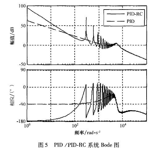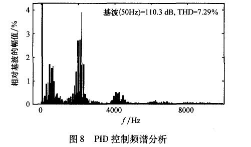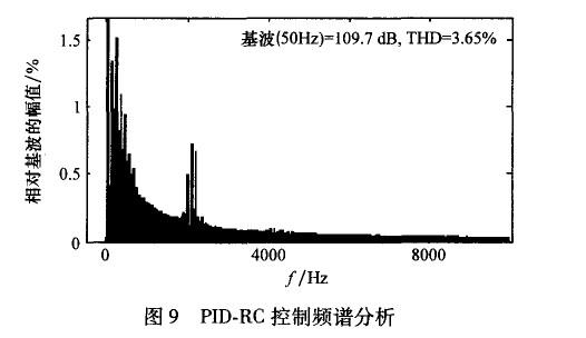在高頻段,開(kāi)環(huán)增益變得非常小,這對(duì)抑制高頻噪聲,提高系統(tǒng)穩(wěn)定性和魯棒性是非常有幫助的。但是,在非諧波頻率處,沒(méi)有嵌入重復(fù)控制器的系統(tǒng)開(kāi)環(huán)增益更大一些,這說(shuō)明重復(fù)控制器對(duì)位于該頻率的信號(hào)控制效果較差。因此,PID控制器在系統(tǒng)中除了有提高系統(tǒng)動(dòng)態(tài)響應(yīng)速度的作用外,還要調(diào)節(jié)非諧波信號(hào),彌補(bǔ)重復(fù)控制器的不足。