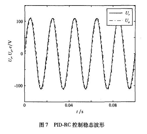 PID控制對(duì)于周期性信號(hào)無(wú)法做到無(wú)差跟蹤,存在周期性穩(wěn)態(tài)誤差。嵌人了重復(fù)控制器的系統(tǒng),輸出能夠很好地跟蹤輸入信號(hào),系統(tǒng)迅速進(jìn)入穩(wěn)態(tài),表現(xiàn)出良好的動(dòng)態(tài)性能。