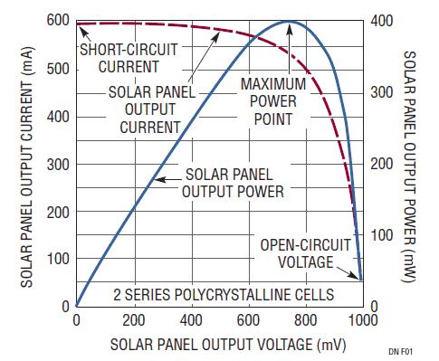 雖然太陽(yáng)能電池或太陽(yáng)能電池板是按照功率輸出來(lái)分類,但電池板的可用功率卻很少是恒定的。其輸出功率在很大程度上取決于光照、溫度以及從電池板吸收的負(fù)載電流。為說(shuō)明這一點(diǎn),圖 1 示出了一塊雙電池太陽(yáng)能板在恒定光照條件下的 V-I 特性曲線。I-V 曲線在短路 (最左側(cè)) 至大約 550mA 負(fù)載電流的范圍內(nèi)具有相對(duì)恒定的電流特性,隨之在較低的電流條件下它遵從于恒定電壓特性,并在開(kāi)路時(shí) (最右側(cè)) 趨近于最大電壓。電池板的功率輸出曲線顯示:功率輸出在大約 750mV/530mA 的地方 (I-V 曲線的拐點(diǎn)處) 出現(xiàn)一個(gè)明顯的峰值。如果負(fù)載電流增至超過(guò)功率峰值,則功率曲線迅速下降至零 (最左側(cè))。同樣,輕負(fù)載也會(huì)使功率趨向于零 (最右側(cè)),不過(guò)這往往不太會(huì)是一個(gè)問(wèn)題。