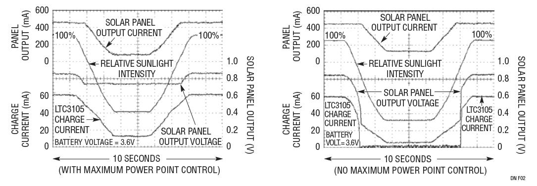 圖 2 示出了在采用和未采用最大功率點(diǎn)控制的情況下,陽(yáng)光的變化對(duì)于充電電流的影響。模擬陽(yáng)光的強(qiáng)度從 100% 降至約 20%,而后回升至 100%。請(qǐng)注意,當(dāng)陽(yáng)光強(qiáng)度下降至 20% 左右時(shí),太陽(yáng)能板的輸出電壓和電流也下降,但是 LTC®3105 的最大功率點(diǎn)控制則可以防止太陽(yáng)能板的輸出電壓降至 750mV 的設(shè)定值以下。它通過(guò)減小 LTC3105 的輸出充電電流以防止太陽(yáng)能板電壓驟降至接近 0V 來(lái)實(shí)現(xiàn)上述功能,如圖 2 中右側(cè)的曲線圖所示。而在未采用功率點(diǎn)控制時(shí),陽(yáng)光強(qiáng)度的小幅下降也會(huì)完全阻斷充電電流的流動(dòng)。